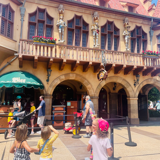 At EPCOT, the Germany Pavilion feels like stepping into a charming Bavarian village full of history and wonder. We began our tour at the Medieval Heart, where the tall clock tower with its musical Glockenspiel rings on the hour, and the dramatic statue of St. George and the Dragon reminds us of courage and determination. Inspired by Rothenburg, a well-preserved medieval town in southern Germany, the architecture sparked many questions from our kids about why buildings had sloped roofs (to shed snow and rain) and why tall towers were built (to watch for danger and show town pride).